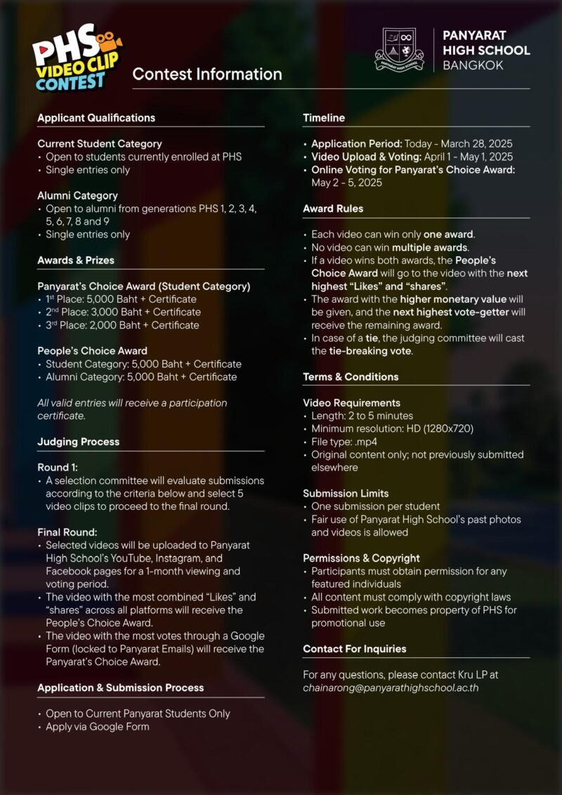 • Selected videos will be uploaded to Panyarat High School’s YouTube, Instagram, and Facebook pages for a 2-week viewing and voting period.